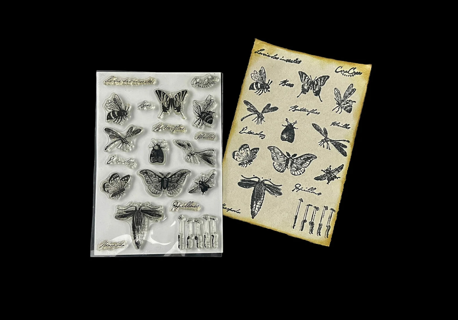 A stunning clear stamp sheet from CoraCreaCrafts featuring diverse insects, bees, and butterflies with a vintage vibe. This stamp sheet measures 11 x 16cm and has 19 stamps!
