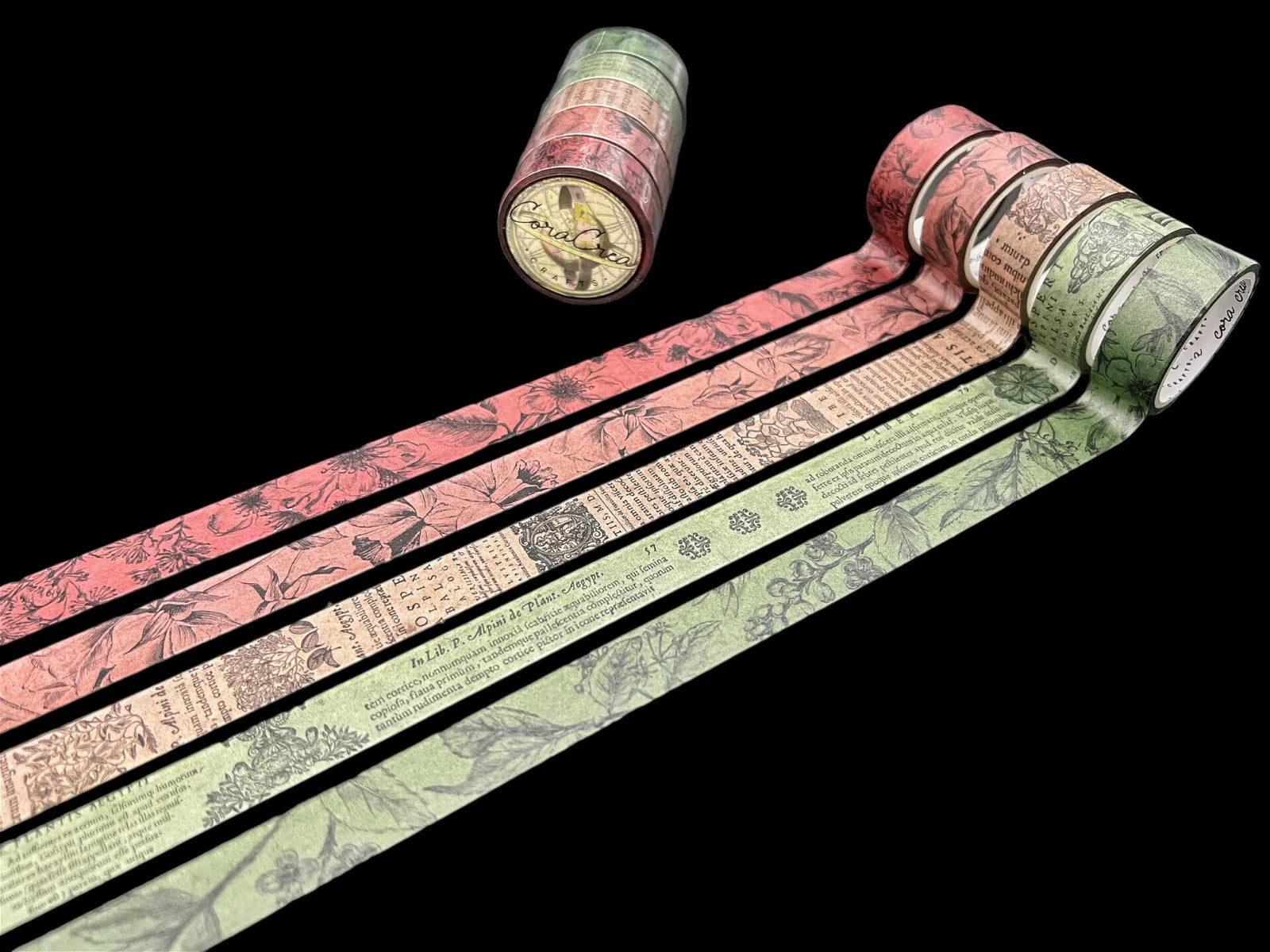 A unique washi tape set is part of the ‘Basics’ collection featuring floral patterns and botanical encyclopedia designs. This is an exclusive design by CoraCreaCrafts.